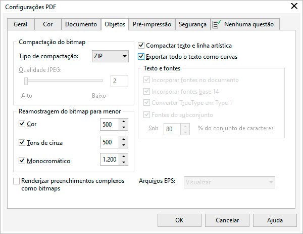 Na aba Objetos, em Tipo de compactação escolha ZIP, deixe selecionada as opções Compactar texto e linha artística e Exportar todo o texto como curvas, mude as opções Cor para 500, Tons de cinza para 500 e Monocromático para 1.200, clique em OK e depois em Salvar.